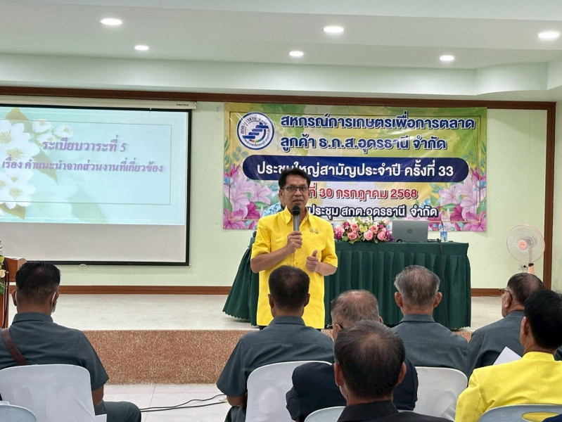 วันที่ 30 กค 2568 ว่าที่ร้อยตรีสุระศักดิ์ บุญชาญ สหกรณ์จังหวัดอุดรธานี พร้อมด้วย นางสาวปณัฐตา มาหา ผู้อำนวยการกลุ่มส่งเสริมสหกรณ์ 1 และคณะ ได้เข้าร่วมประชุมใหญ่ของสหกรณ์การเกษตรเพื่อการตลาดลูกค้า ธ.ก.ส.อุดรธานี จำกัด ในโอกาสนี้ ว่าที่ร้อยตรีสุระศักดิ์ บุญชาญ ได้มอบนโยบายและบรรยายพิเศษภายใต้ โครงการส่งเสริมจริยธรรมและธรรมาภิบาลในสหกรณ์ ประจำปี โดยเน้นย้ำถึง แนวทางการขับเคลื่อนมาตรฐานด้านจริยธรรมและธรรมาภิบาลในสหกรณ์ เพื่อให้สหกรณ์ดำเนินงานอย่างโปร่งใส เป็นธรรม และสร้างความเชื่อมั่นให้กับสมาชิก นอกจากนี้ สหกรณ์จังหวัดอุดรธานียังได้ แนะนำแผนพัฒนาสหกรณ์สู่ความเข้มแข็ง พร้อมทั้งเน้นย้ำถึงความสำคัญของการ ส่งเสริมให้สมาชิกมีส่วนร่วมในการดำเนินธุรกิจของสหกรณ์ เพื่อให้เกิดการพัฒนาที่ยั่งยืนและตอบสนองความต้องการของสมาชิกได้อย่างแท้จริง