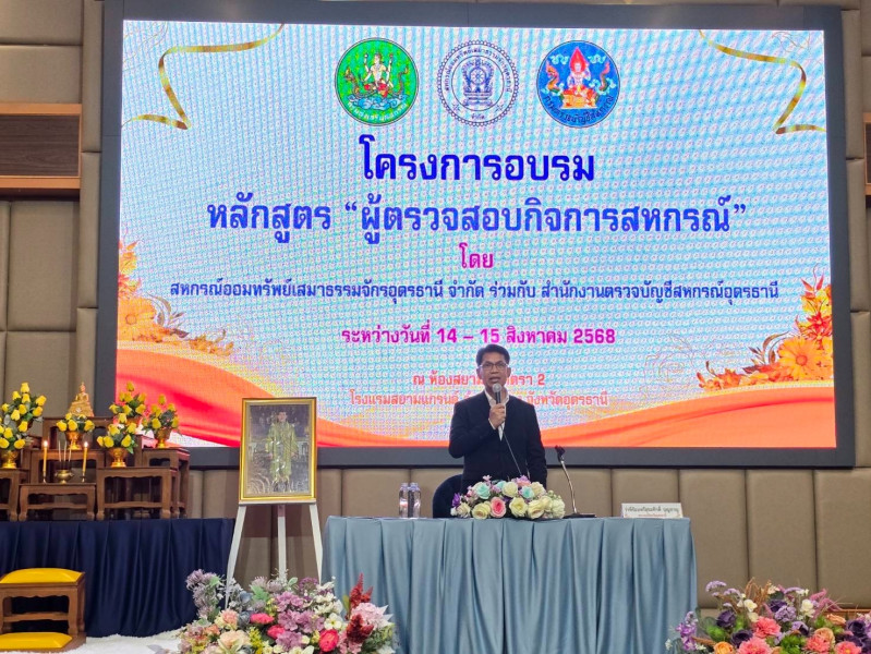 วันที่ 14 สิงหาคม 2568 เวลา 09.00 น. ว่าที่ร้อยตรี สุระศักดิ์ บุญชาญ สหกรณ์จังหวัดอุดรธานี เป็นประธานเปิดโครงการฝึกอบรม หลักสูตร “ผู้ตรวจสอบกิจการสหกรณ์” และเป็นวิทยากรบรรยายให้ความรู้ในหัวข้อเรื่อง “หลักการ วิธีการสหกรณ์ กฎหมายสหกรณ์ และกฎหมายที่เกี่ยวข้องกับการดำเนินงานสหกรณ์” ณ โรงแรมสยามแกรนด์ อำเภอเมืองอุดรธานี จังหวัดอุดรธานี โดยมีผู้เข้าร่วมอบรมฯ จำนวน 110 คน