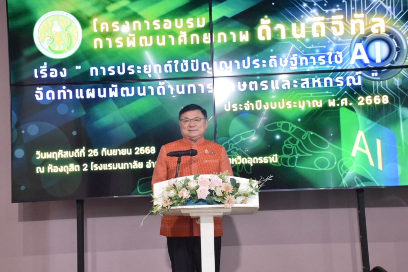 วันที่ 25 กันยายน 2568 เวลา 09.00 น. นายณฐพล วิถี รองผู้ว่าราชการจังหวัดอุดรธานี เป็นประธานเปิดอบรมการพัฒนาศักยภาพด้านดิจิทัล “การประยุกต์ใช้ปัญญาประดิษฐ์ การใช้ (AI) จัดทำแผนพัฒนาด้านการเกษตรและสหกรณ์” ประจำปีงบประมาณ พ.ศ. 2568 โดยว่าที่ร้อยตรี สุระศักดิ์ บุญชาญ สหกรณ์จังหวัดอุดรธานี ได้มอบหมายให้นางสาวแคทริน ครโสภา นักวิเคราะห์นโยบายและแผน และนางสาวอุษณียาภรณ์ แก้วภูบาล เจ้าพนักงานธุรการ ฝ่ายบริหารทั่วไป เข้าร่วมอบรมฯ ณ ห้องดุสิต 2 โรงแรมนภาลัย อำเภอเมืองอุดรธานี จังหวัดอุดรธานี