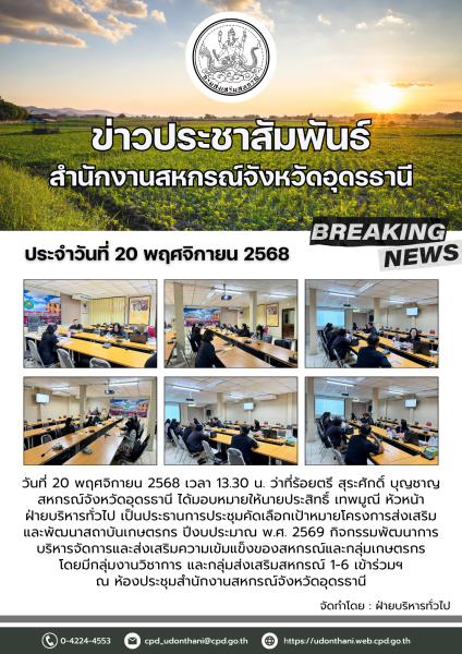 วันที่ 20 พฤศจิกายน 2568 เวลา 13.30 น. ว่าที่ร้อยตรี สุระศักดิ์ บุญชาญ สหกรณ์จังหวัดอุดรธานี ได้มอบหมายให้นายประสิทธิ์ เทพมูณี หัวหน้าฝ่ายบริหารทั่วไป เป็นประธานการประชุมคัดเลือกเป้าหมายโครงการส่งเสริมและพัฒนาสถาบันเกษตรกร ปีงบประมาณ พ.ศ. 2569 กิจกรรมพัฒนาการบริหารจัดการและส่งเสริมความเข้มแข็งของสหกรณ์และกลุ่มเกษตรกร โดยมีกลุ่มงานวิชาการ และกลุ่มส่งเสริมสหกรณ์ 1-6 เข้าร่วมฯ ณ ห้องประชุมสำนักงานสหกรณ์จังหวัดอุดรธานี